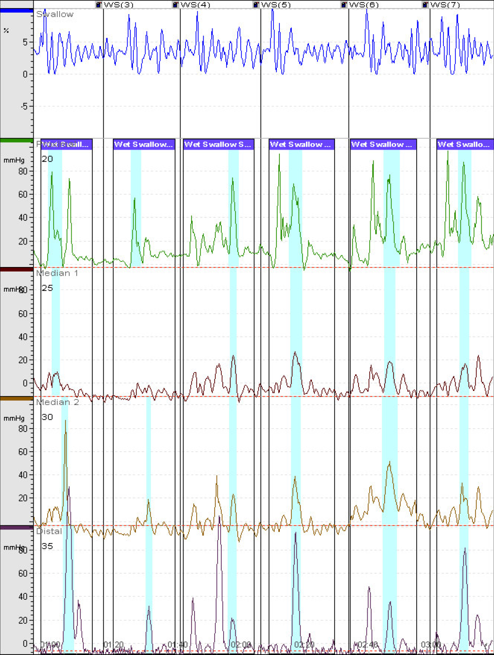 - >10% ταυτόχρονες συσπάσεις με τουλάχιστον μια φυσιολογική περισταλτική σύσπαση κατά τη μελέτη του σώματος του οισοφάγου (δείτε την σχετική εικόνα).